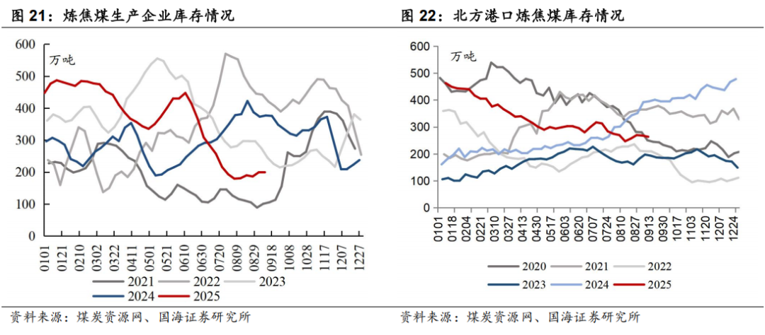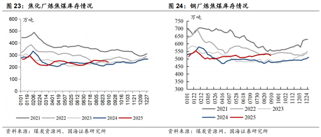 炼焦煤库存:焦煤生产企业库存仍处较低水平。2025年8月底较月初,炼焦煤生产企业库存环比增加6.85万吨至186.15万吨,但仍处于较低水平;焦化厂炼焦煤库存减少4.71万吨至251.09万吨;钢厂炼焦煤库存增加5.05万吨至524.41 万吨。