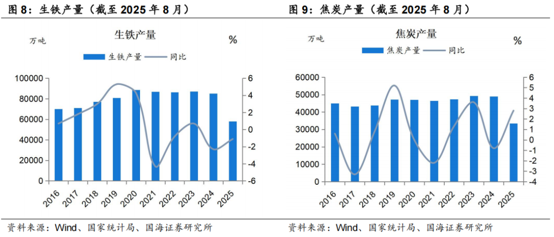 2025年8月,我国实现生铁产量6,979.00万吨,同比+1.00%,同比增速较上月提升2.40pct;焦炭产量4,260.00万吨,同比+3.90%,同比增速较上月提升3.40pct。2025年1-8月,我国实现生铁累计产量57,907.00万吨,同比-1.10%;焦炭产量33,406.00万吨,同比+2.80%。