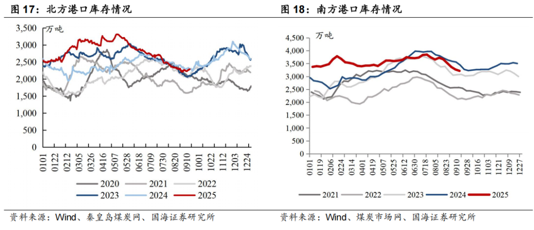 库存,动力煤库存:北方港口库存去化流畅。2025年8月末,动力煤生产企业库存较月初(下同)提升8.3万吨至416.40万吨;北方港口动力煤库存减少250.50万吨至2,223.20万吨,去库效果较佳,同比去年同期减少143.3万吨;沿海八省电厂库存降低85.5万吨至3,412.20 万吨;内陆十七省电厂库存降低202.6万吨至8,526.30万吨。