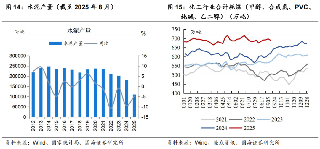 2025年8月,全国水泥产量1.5亿吨,同比-6.20 %,同比降幅相较7月扩大0.60 pct;2025年8月化工行业合计耗煤(甲醇、合成氨、PVC、纯碱、乙二醇)3433.12万吨,同比+15.14%,同比增速较7月下降2.74pct。