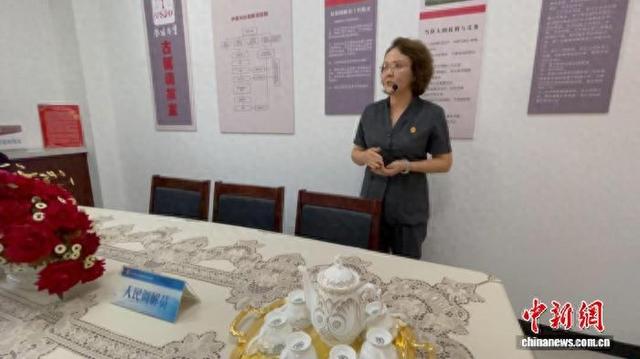 9月15日,记者随最高人民法院新闻局实地走访新疆,其间来到头屯河人民法庭。图为法官古丽米然·热杰甫在“古丽调解室”讲解。中新社记者 张素 摄