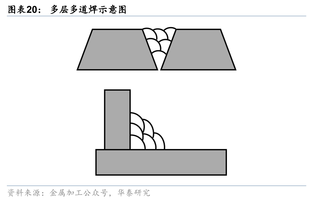 坡口焊缝质量要求相对高的根本原因是厚板熔透需求。为保证厚板焊接强度,会要求焊缝金属穿过整个接头厚度范围内的坡口焊缝,即熔透。而对于薄板焊接强度要求不高,则可采取角焊缝形式。对于厚板焊接中双面焊接成型的全熔透焊缝,还需要进行清根操作,即在施焊完一面对反面施焊之前,使用适当的工具从反面对完成的焊缝根部清理的过程,自动化焊接难度较高。同时在焊接较厚的焊缝时,需将焊缝分为多个层次,每一层又分为多道焊接,按照特定的顺序逐层逐道焊接,最终完成整个焊缝,即多层多道焊。由于需要对同一焊缝进行多道焊接,前道焊缝的成形质量及其带来的焊接变形会影响后续焊缝起始点定位的精度和路径规划的准确性,对工艺积累、焊缝识别、焊接参数实时调整提出了更高要求,目前智能焊接可初步应用但效果不佳,仍待后续突破。
