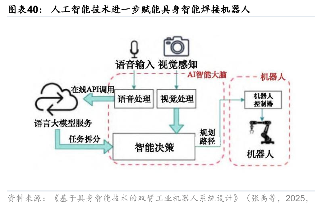 随AI技术进一步发展,具身智能有望真正具备“端到端”能力,实现“像人一样焊接”。首先从机器人本体来看,轮式或足式机器人可以更灵活的在大空间中移动,提升焊接效率,解决以往工业机器人可达性不足的问题。此外可自主移动相当于给机器人本体加上了新的外部轴,使其从运动控制上可以更“类人化”,以实现更多的焊接场景。其次从软件算法端来看,未来随AI技术进一步发展,智能焊接机器人可实现多模态输入,具身智能有望真正具备“端到端”能力。此外通过数据训练模型可反向弥补软件层焊接工艺的不足,无需人工扩充工艺库的案例,形成更强的泛化能力,最终实现“像人一样焊接”的终极目标,有望攻克中/大组立场景难题。