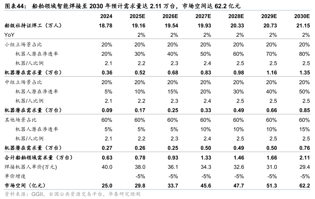 经测算,预计到2030年船舶行业智能焊接机器人需求量达2.11万台,对应62.2亿元市场空间。与钢结构行业的测算类似,我们假设:1)焊工人数:据高工机器人,2024年船级社持证焊工人数达18.78万人,假设未来以2%的速度缓慢增长。2)下游场景占比:分为小组立、中组立及其他场景,由于船舶焊接主要包括小组立、中组立、大组立、总组立、整船合拢5步焊接工序,其部件相同而焊缝形态、数量、位置不同,假设5步焊接工序占比均为20%。3)机器人潜在渗透率:假设小组立场景从2024年的20%增长至远期的80%,而中组立场景随具身智能等技术应用也从2024年的5%增长至远期的50%,其他场景也有部分部件可以导入,假设从2024年的5%增长至15%;4)机器替人比例:代表焊接机器人的效率,与钢结构类似,假设比例从2.1逐步增长至2.5;5)单价增速:由于船舶领域价格较高,假设2024年机器人单价为40万元且年均降低5%。由此测算得预计到2030年船舶行业智能焊接机器人需求量达2.11万台,对应62.2亿元市场空间。