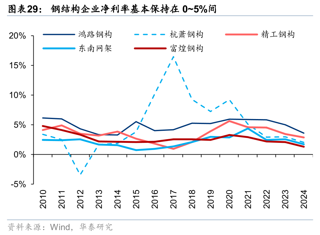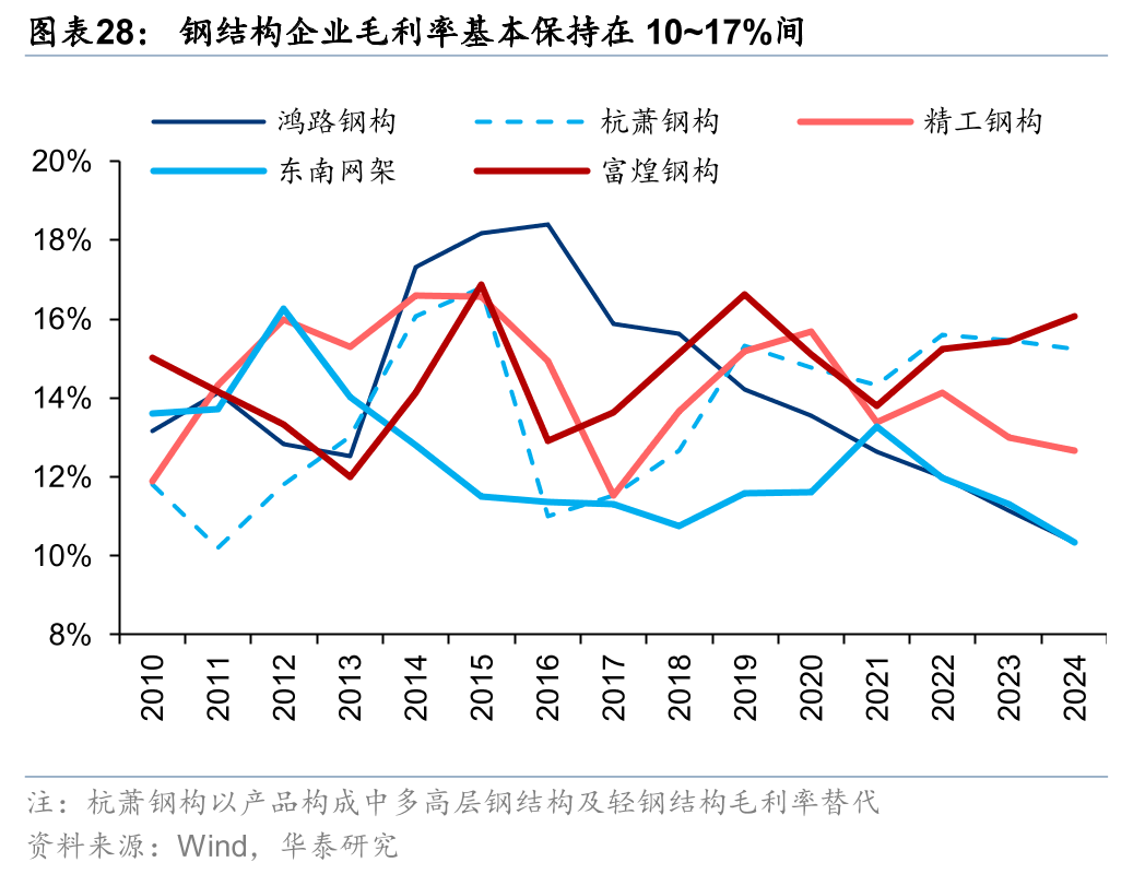 钢结构行业竞争激烈,利用机器替人以降本增效的诉求较强。钢结构行业呈现“大行业、小公司”格局,行业五大上市公司鸿路钢构、杭萧钢构、精工钢构、东南网架、富煌钢构2023年市占率分别达4.0%、1.4%、1.1%、0.6%、0.4%,合计达7.5%左右。而行业中小型企业数量则更多,行业竞争激烈、格局较为分散。行业毛利率长期处于10%~17%间、净利率处于0~5%间(杭萧钢构因有地产、技术转移等业务因此利润率波动较大)。钢构企业需要高性价比自动化设备降低人工成本,增厚利润。
