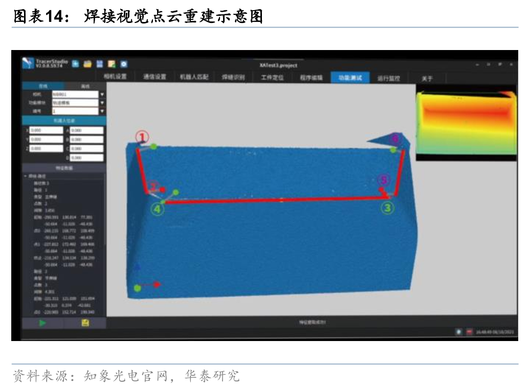 2)工件模型构建的高效化:在智能焊接阶段中,需要首先生成工件与焊缝的模型,后续软件才能自动规划决策。而对于模型构建的方式又派生出参数化编程、模型输入、点云重建三种技术路线,进一步提升效率。①最初始的形态为参数化编程,即对常见形式的工件几何尺寸等关键参数进行输入,使编程时间从小时级缩减至分钟级、无需专业编程知识、可模板化复用。②而直接进行模型输入的路线对工件模型或图纸直接输入,无需编程且解决了参数化编程只能处理数据库内有的常见工件的问题,但也有部分工件无现有模型或格式不匹配等缺点。③最新的解决方案是点云重建,即通过线扫相机及3D或线激光相机获取工件及焊缝表面的三维坐标点云数据,并进行逆向建模,进而实现智能焊接。该路线完全无需现有模型、智能化程度高,极大提升效率,短期来看是免示教焊接软件层面的“最优解”。