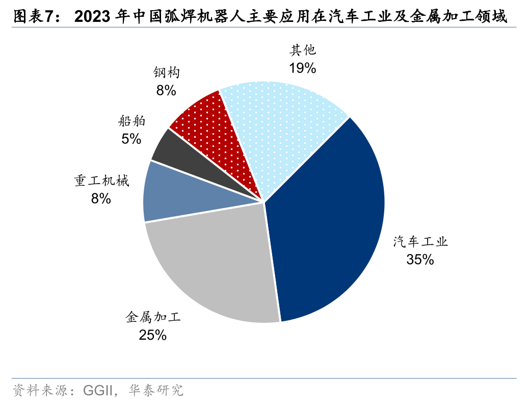传统示教焊接机器人下游应用主要集中在汽车工业与金属加工领域。传统焊接机器人主要采用示教方案,即作业前需要工人事先通过示教器编程或手动拖拽的方式引导机器人执行整个焊接过程,机器人记录过程中的动作指令,包括焊接位置、姿态及参数等,在工人完成示教后,机器人对记录的路径及参数进行复现,完成焊接任务。目前焊接机器人的应用最大的焊接类型是弧焊,其销量从2016年的1.41万台增长至2024年的3.51万台,17-24年CAGR达12.1%。而其下游应用主要集中在汽车工业及金属加工领域,2023年占比分别达35%、25%;而在焊接工人较为短缺的钢结构及船舶领域相对较少涉及,占比仅为8%、5%。近年来我国弧焊机器人销量有所波动,22-23年制造业需求增速放缓,传导至汽车、金属加工等下游应用领域,导致弧焊机器人的需求有一定收缩;24年以来随着以汽车为代表的下游行业的产量扩张,弧焊机器人销量回升至3.51万台,同比+22.73%。