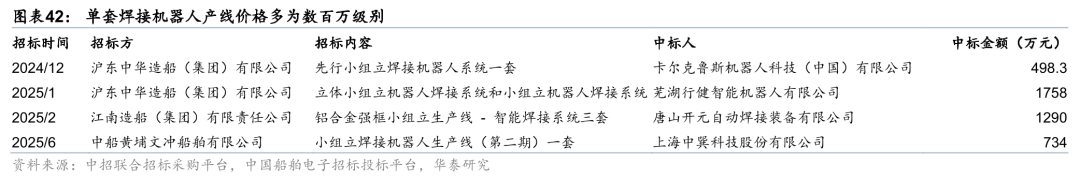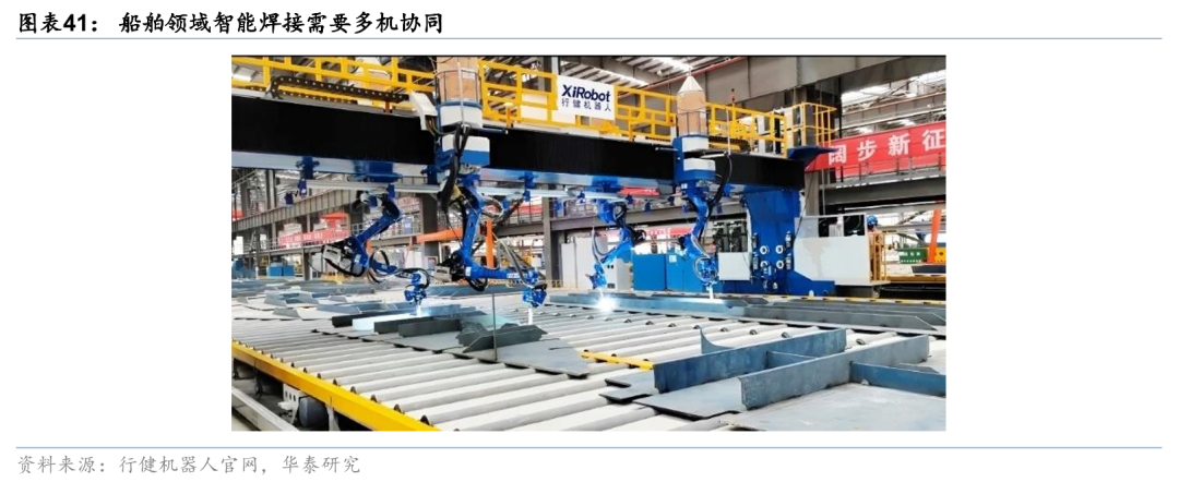 船舶领域智能焊接需多机协同,单个工作站价值量较大。由于船舶场景中工件尺寸较大、数量较多,焊接工作站常需采取龙门的形式,占地面积较大。而厂房空间有限,因此需要智能焊接有更高的效率才能在船舶领域落地,因此工作站常采取双机、四机协同的方式以提升效率。一方面单个工作站价值量远超钢构领域,根据近期船厂招标采购情况,单套焊接机器人产线价格多为数百万级别。另一方面多机协同也对机器人路径规划、运动控制提出了更高的要求,提升系统附加值。