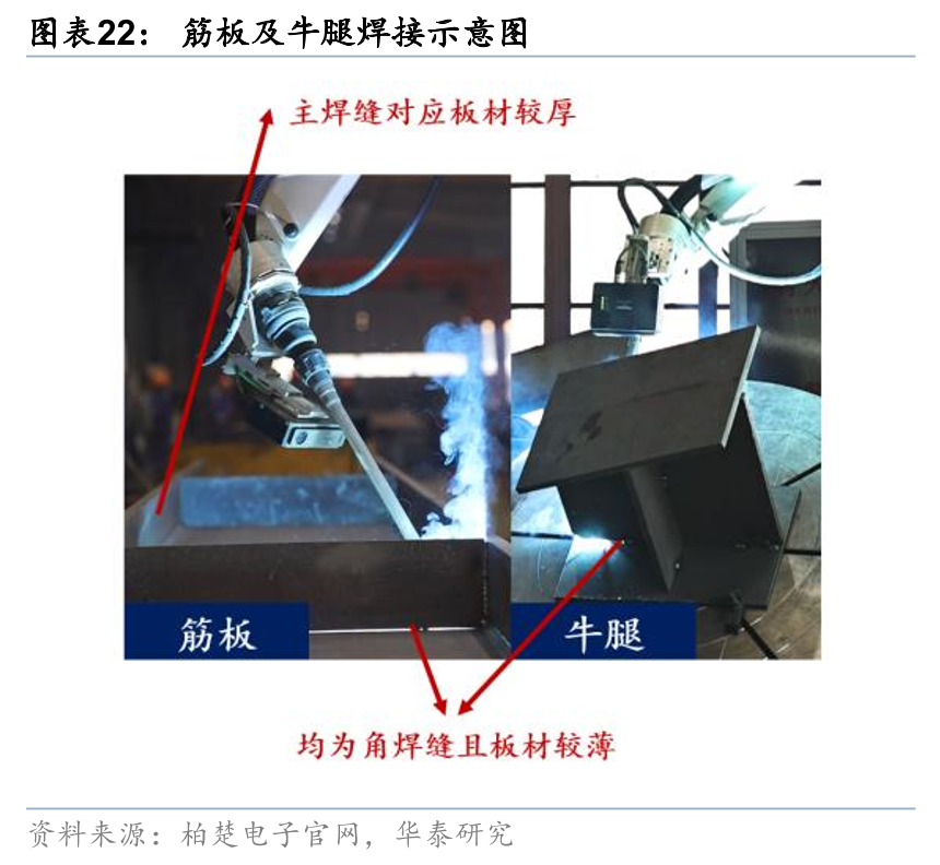免示教焊接机器人目前主要在加工难度较小、质量要求较低的角焊缝试点应用。据《浅谈钢结构智能焊接的几点思考》2019年对某钢结构制造企业的调研,该企业以“筋板角焊缝”和“牛腿角焊缝”为突破口进行智能焊接机器人的试点,并从人工示教转向视觉识别。可见智能焊接在薄板领域最先突破,随技术进展未来厚板焊接领域也将加速渗透。