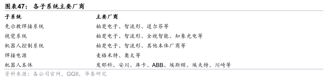 部分厂商专注于细分领域设备供应。除集成商外亦有部分厂商专注于部分子系统的开发,通过在单一领域的深耕获取竞争壁垒,如柏楚电子及智流形在免示教焊接系统、视觉系统及机器人控制系统均有涉足;道尔芬专注于免示教系统研发并开放免费试用。而全视智能及知象光电等厂商分别在线激光相机及3D相机领域深耕。麦格米特及奥太聚焦于焊接电源领域,而机器人本体则由“四大家族”、埃斯顿、埃夫特等传统厂商占据。