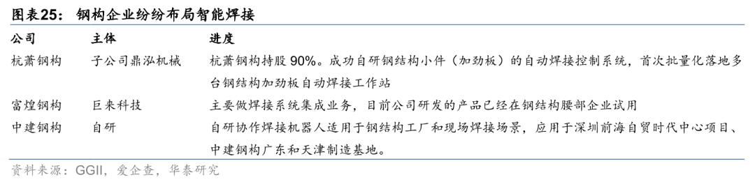 钢构企业纷纷跟注,重视智能焊接布局。除鸿路钢构外,部分企业也通过控股公司等方式布局智能焊接行业。钢结构企业对应用场景理解深刻、工艺数据积累丰富、反馈迅速,自主研发具备一定优势,但也存在人才储备较为匮乏的问题。因此钢结构企业主要完成终端产品的自主集成,而系统等技术研发依赖对外投资等方式弥补。