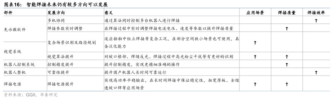 免示教焊接未来还可多机协同设计、算法优化等角度进一步提升焊接质量与效率,拓宽应用范围。软件端中免示教软件及视觉系统尚有较大发展空间,特别是在一些复杂场景识别及焊缝反光问题上处理能力不到位,导致应用场景受限或工件需要频频返工补焊。若可在算法及视觉硬件上有所提升,可进一步使智能焊接向船舶中组立、钢结构全熔透坡口焊等复杂场景渗透。同时软件层面还有多机协同及焊缝参数实时调整等技术发展方向,这些技术虽然在产业中有所落地,但仍可进一步提升以保证焊接质量与效率。硬件方面,主要关注机器人本体及焊接电源国产与国际厂商的差距,国内硬件设备可靠性仍需有所提升,保证硬件与软件系统的配合。