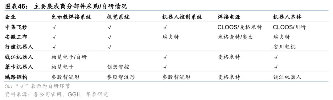 主要整体方案提供商均具备部分系统自研能力。市场中的集成商大致可分为三类:①具备智能焊接系统端核心技术,如中集飞秒、安徽工布等企业。其具备免示教焊接系统、视觉系统的研发能力,部分企业还延伸至机器人控制系统部分,通过软件算法赋能智能焊接。同时通过适配机器人本体及焊接电源等硬件实现整体解决方案提供。②部分传统机器人本体厂商,如钱江机器人、藦卡机器人等,由于其客户对智能焊接需求逐步增长,其需要集成系统以保证下游需求。由于本体厂商软件研发能力较弱,前期一般会寻求软件商直接适配。③终端用户自主集成,如鸿路钢构等。由于缺乏直接的自主研发能力而依赖对外投资。主要可以通过批量采购各类子系统以实现规模优势、降低成本。其产品主要用于自用,小部分可以用于对外销售。
