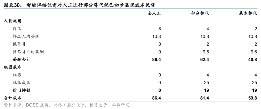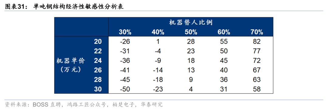 在单元场景中,钢构企业使用免示教焊接机器人可节约大量人工成本。为更好说明机器替人的降本作用,我们假设如下的场景:1)全人工方案下,一个小组包括8名焊工,分为两个班组,每班4人。根据鸿路钢构在招聘网站上发布的信息,一名焊工月工资平均为0.9万元,则该班组年均人工成本约86.4万元。2)机器替人方案下,我们基于柏楚电子定增问询函回复内容:“智能焊接机器人规划每台可取代2-3个焊工工位,保守按替代2个工位测算”,假设焊工与机器人焊接效率相近。那么每个班组将会被4台机器人替代,而由于机器可实现两班倒,因此每班只需再配1名操作员即可,即为4台机器人、两名操作员。其中假设焊接机器人成本为25万元/台,且按折旧年限5年、残值率5%计提折旧;而机器人操作员由于技术要求较低,根据鸿路工匠公众号招聘信息月均工资约为0.8万元。同时由于受限于软件系统能力,在部分焊接难度较高的部分需要焊工定位焊及补焊,而在软件系统迭代后可替代的焊工比例不同。我们假设部分替代情况、基本替代情况下每班4名焊工被替代至只剩2名、1名焊工,则在假设场景内需4名、2名焊工。由此计算得合计成本分别为81.4万元、59.8万元。可见仅需对人工进行部分替代就已初步显现成本优势。