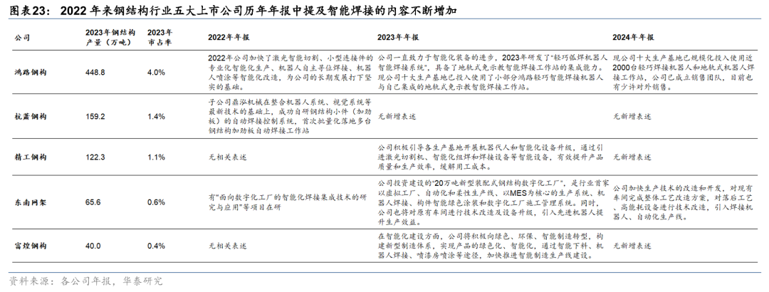 钢结构目前是免示教焊接机器人的主要下游应用,近两年终端企业布局加速。钢结构工件存在“小批量、多品种”特征,非标属性较强,适合免示教焊接机器人的应用。同时行业发展速度较快,终端导入随之走上快车道。从钢构行业五大上市公司年报来看,行业在2022年基本处于前期研发试用阶段,在2023年开始初步落地使用、进入生产场景,在2024年后开始加速应用,未来终端渗透率有望进一步提升。