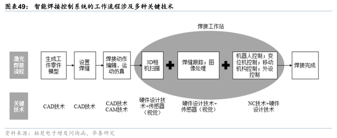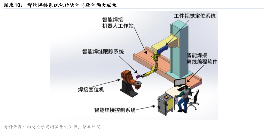 软件部分:①免示教焊接软件:通过参数化编程、模型导入、点云重建等方式构建工件与焊缝模型,同时系统自动生成焊接路径、匹配焊接工艺,在仿真模拟焊接并检查路径合法性后,系统将焊接任务发送给焊接控制系统执行。②视觉系统:包括工件视觉定位系统(含线扫相机)及智能焊缝跟踪系统(含3D结构光相机或线激光相机)。前者为焊接机器人提供宏观视觉定位与匹配,降低对工件摆放位置的要求;后者提供精确的微观视觉,精准探测焊缝空间位置以配合焊接系统进行跟踪焊接,同时还可分析焊缝几何变形情况并匹配工艺,实现非标件柔性加工。③控制系统:经免示教软件及视觉系统规划焊接路线后,通过集中控制机器人工作站、焊接变位机等设备实现工件智能自动焊接。