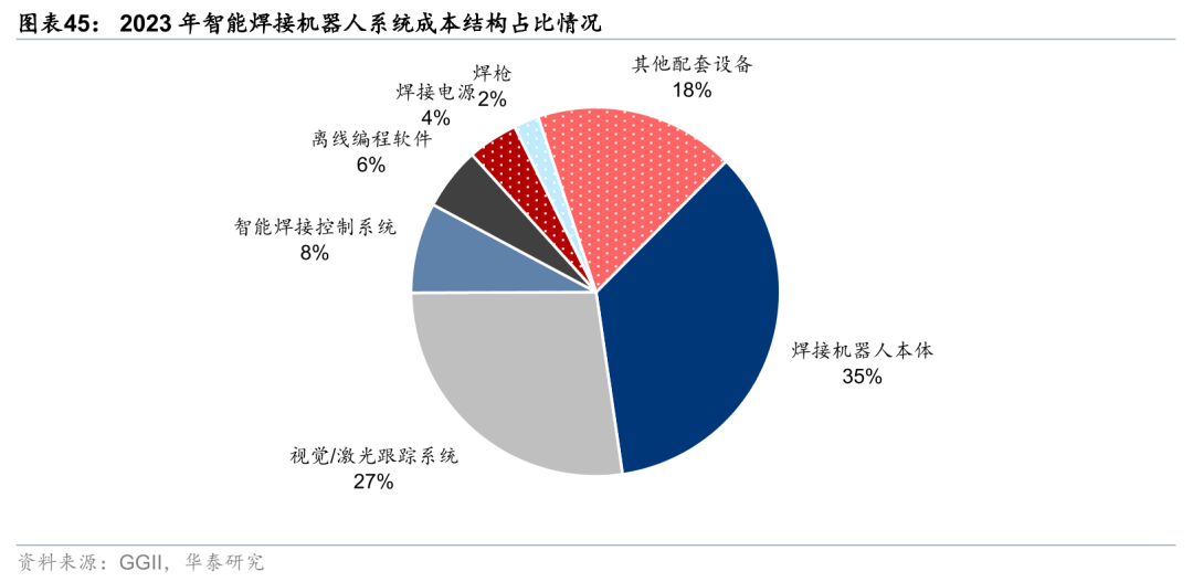从价值量看,机器人本体及三大软件系统约占成本的76%。据高工机器人数据,2023年智能焊接机器人成本构成中最大板块仍为机器人本体,占比达35.16%。而三大软件系统分列其后,分别为视觉系统(含相机)的27.25%、控制系统的7.91%及免示教离线编程软件的5.49%,合计约40.65%。而焊接电源、焊枪等其他配件合计成本占比约24.18%,价值量偏低。