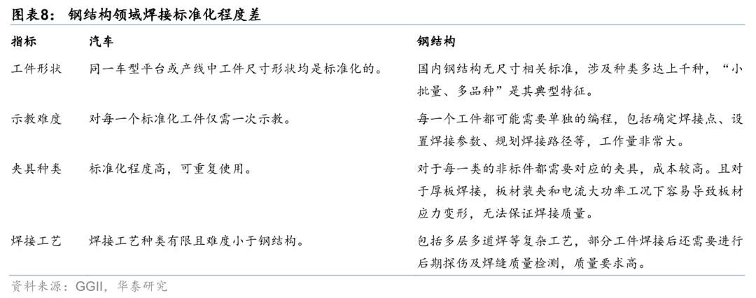 钢结构等行业非标属性强,重复示教导致人力与时间成本增加,传统焊接机器人难以应用。对于汽车工业来说,同一车型平台中工件的尺寸及形状的标准化程度高且批量大,冲压件与结构件尺寸公差也较小,因此仅需一次示教就可重复进行精准高效的焊接。我们将钢结构作为非标焊接领域的典型场景进行对比,“小批量、多品种”是其典型特征。若采取传统示教方案,需要对每一个工件进行单独的编程示教,产生较大的人工成本与时间耗费。同时示教焊接依赖工装夹具对工件进行精确定位,在汽车领域夹具的标准化程度高、可复用,但对钢结构而言每一非标件都需要相对应的夹具,成本较高。同时在钢结构厚板焊接的大功率、高热输入场景下,夹具易使板材变形,无法保证焊接质量。此外,钢结构所需的多层多道焊等复杂工艺及质量要求也对示教焊接的应用产生了阻碍。