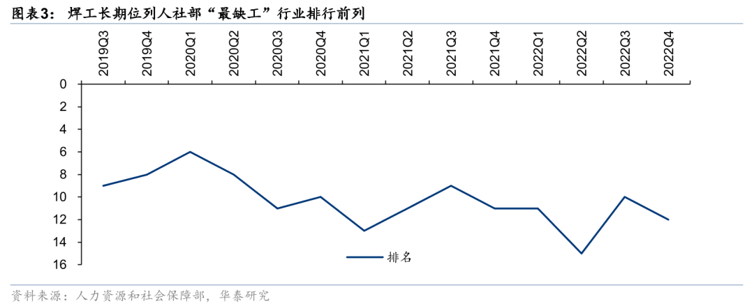 从供给端来看,年轻人入行意愿低,“老师傅”逐步退休,招工难窘境之下焊工供给将逐步减少。焊工工作强度高且工作环境恶劣,高温、高噪音、强光、金属粉尘与废气、高放射性环境使焊工职业病及工作事故风险增加。面对较高的付出,年轻人从事焊工工作的意愿较低。而据钢结构行业协会统计数据,目前“60后”“70后”焊工合计占比达61%,“80后”占比为26%,“90后”占比仅为13%。焊接工作对经验与年资的要求较高,一般要连续从事焊接工作17年以上才可获得高级技师资格。随着焊工队伍中具备丰富经验的中坚力量逐步退休,技能人才梯队面临断层风险,焊工供给将逐步减少。