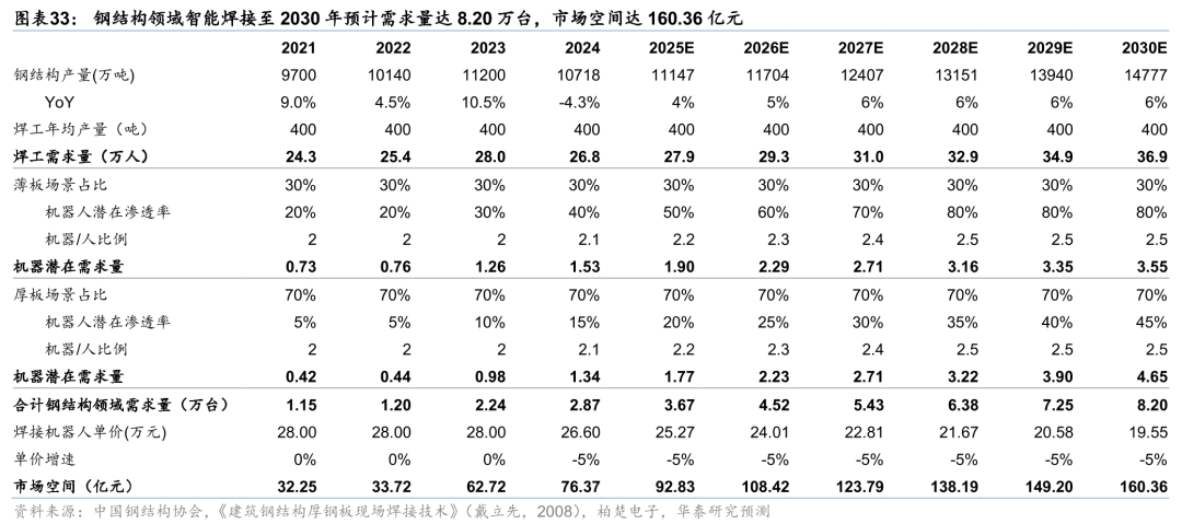 根据我们测算,预计到2030年钢结构行业智能焊接机器人需求量达8.20万台,对应160.36亿元市场空间。关键假设:1)钢结构产量:考虑到钢结构的应用受益于建造成本下降与装配式建筑政策的支持,渗透率有望加速提升,驱动钢结构产量回升,我们假设2027~2030年钢结构产量同比增速稳定在6%左右。2)焊工人数:据中国钢结构协会数据,我们假设单个焊工年均焊接量为400吨/年,由此可推算出焊工需求量。3)下游应用场景:根据智能焊接在下游应用的困难程度,我们将其划分为薄板场景及厚板场景两类,占比分别为30%、70%。4)机器人潜在渗透率:我们将智能焊接机器人由于技术限制在各场景下最高能达到的空间称为机器人潜在渗透率,假设其在薄板焊接领域从2024年的40%迅速提升至2030年的80%,而在厚板领域从2024年的15%缓慢提升至2030年的45%。5)机器替人比例:与前述经济性测算关注要点不同,我们仅需关注多少机器可以完成原有焊工工作量,即机器人的焊接效率。由于焊接机器人可以实现两班倒,因此可以至少替代2个焊工,而随机器人本身的焊接效率及终端使用效率的提升,假设机器替人比例将逐步增长。6)焊接机器人单价:随行业竞争加剧、技术迭代及规模效应使成本下降,预计未来焊接机器人平均单价将年均降低5%。基于此我们计算得2030年钢结构行业智能焊接机器人需求量达8.20万台,对应160.36亿元市场空间。