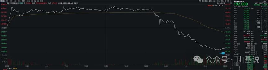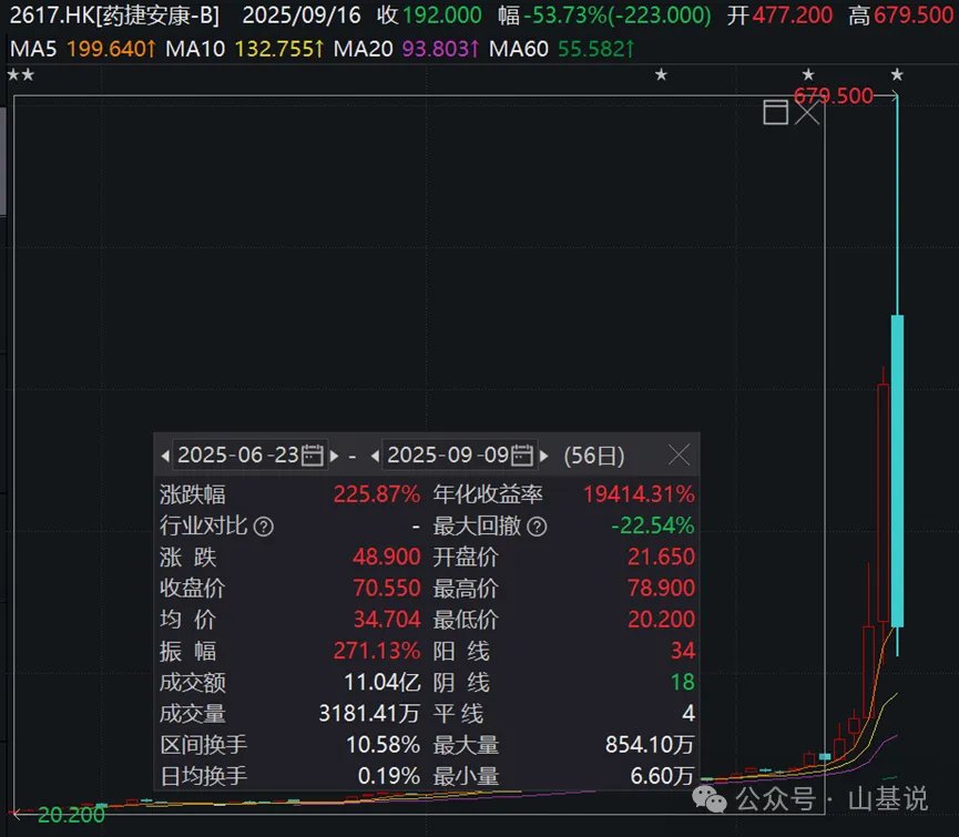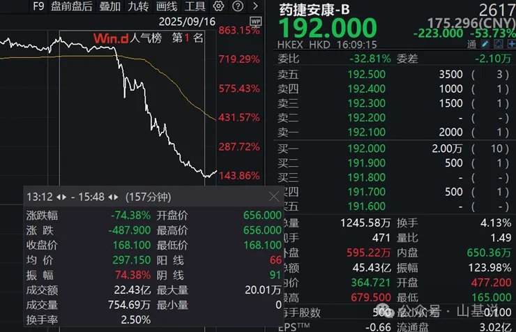 我们看分时图,很明显的成交在一头一尾。暴跌是在下午2点10分后开始的,3点钟以后放量下跌,大部分是卖盘;接近收盘大部分是买盘。药捷安康在早盘最高市值接近2600亿,放在A股大概是京沪高铁的水平(京沪高铁24年营收400亿)。最高涨55%,收盘跌53%。即便如此,这个800万营收的公司的公司还有762亿港元的市值。