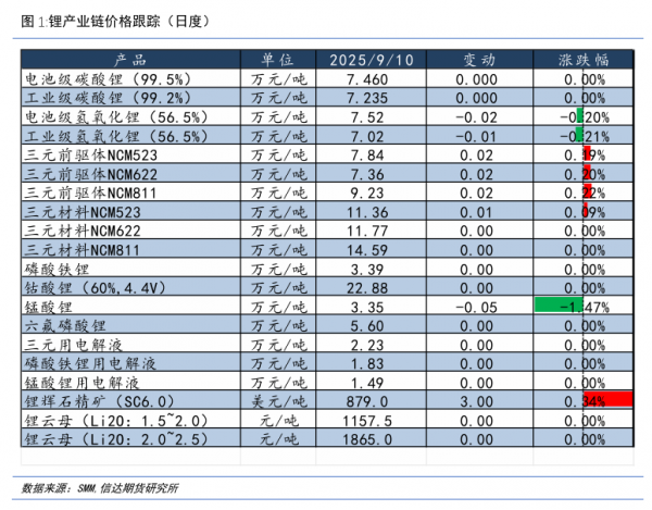 9月16日LC盘面受到前一日盘后中央再次强调反内卷以及供给侧改革,且夜盘黑色系情绪高涨的影响开盘后出现情绪性的高开上行。但是本身品种缺乏持续上行的驱动,故LC日内冲高后持续回落。随着十一假期的临近,下游或出现季节性的补库行为,在需求端依旧有偏强的支撑,但是要想上突破7.5万元则需要更有效的驱动。