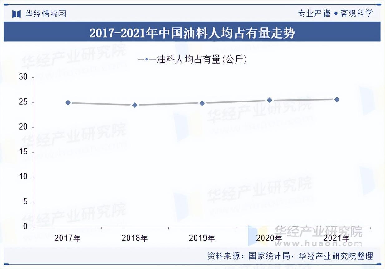从油料人均占有量来看,走势较为平稳,保持在25公斤的水平上下浮动;据国家统计局数据,2021年中国油料人均占有量为25.58公斤,较上年增加0.16公斤。