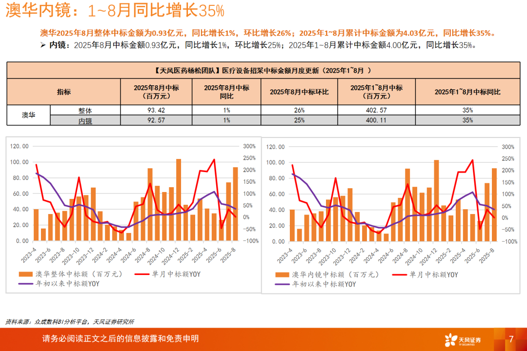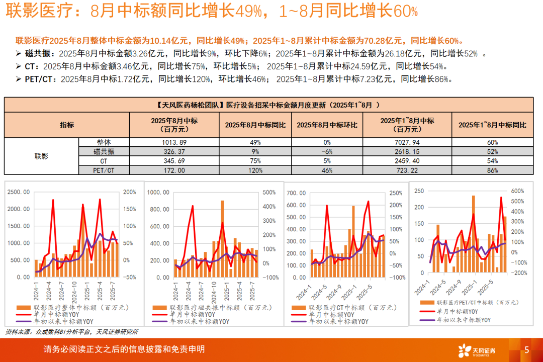 联影医疗8月中标总额10.14亿元,同比增长49%,其中,PET/CT增速最快,同比增长86%;1~8月整体中标总额70.28亿元,整体同比增长60%;开立医疗8月中标总额1.50亿元,同比增长63%,其中,软镜增速最快,同比增长115%;1~8月整体中标总额8.90亿元,整体同比增长97%;迈瑞医疗8月中标总额8.50亿元,同比增长18%,其中,超声增速最快,同比增长51%;1~8月整体中标总额59.04亿元,整体同比增长49%;澳华内镜8月中标总额0.93亿元,同比增长1%;1~8月澳华内镜整体中标总额4.03亿元,整体同比增长35%;万东医疗8月中标总额1.37亿元,同比增长200%;1~8月万东医疗整体中标总额9.36亿元,整体同比增长107%;山外山8月中标总额0.48亿元,同比增长78%;1~8月山外山整体中标总额2.84亿元,整体同比增长194%。