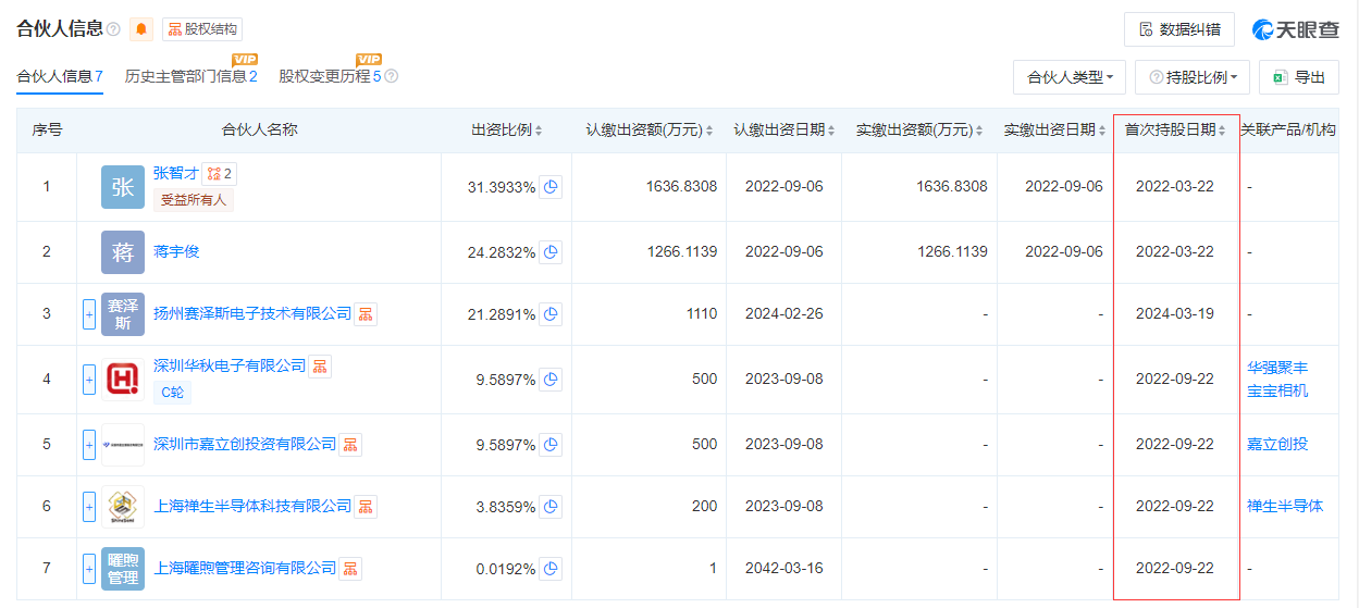 据天眼查,琻捷电子收购聚洵半导体时的交易对象中,华秋电子、嘉立创、上海禅生分别持有共青城英锐创投资合伙企业(有限合伙)(以下简称共青城英锐创)9.5897%、9.5897%和3.8359%的出资份额比例(正式入股时间为2022年9月)。此外,自然人张智才、蒋宇俊持有共青城英锐创31.3933%、24.2832%的股份(持股自2022年3月起)。