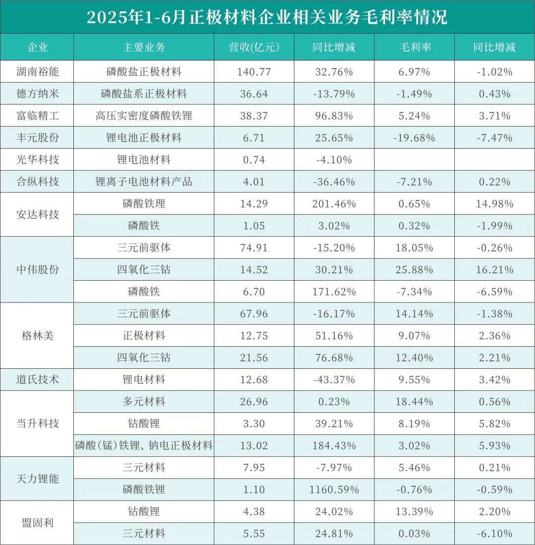 2025年1-6月锂电正极材料上市企业主营业务具体构成情况如下: