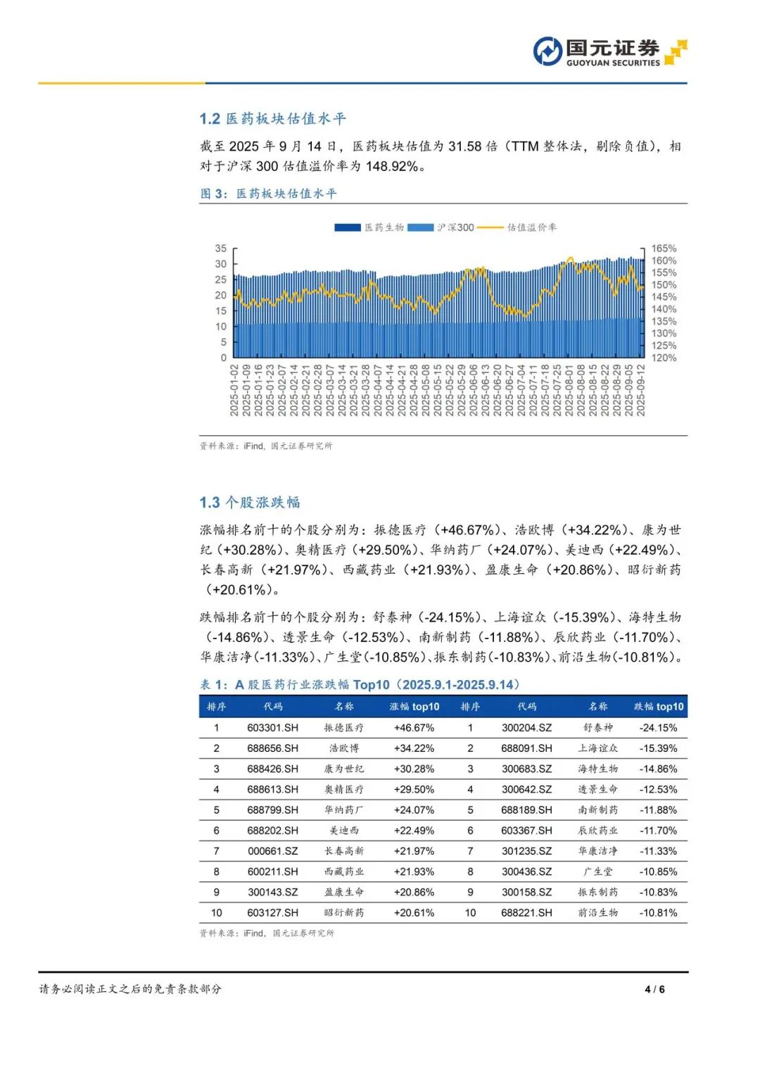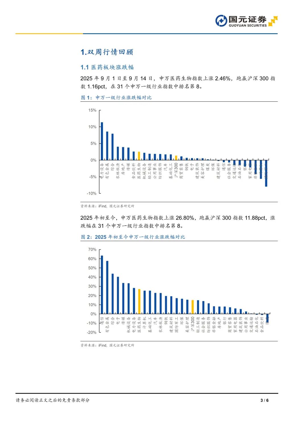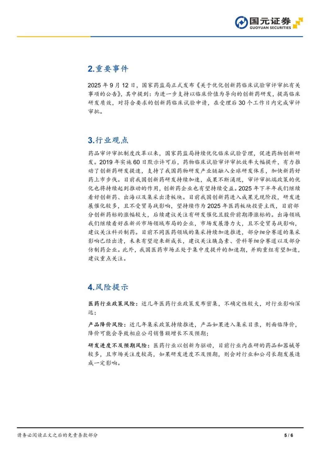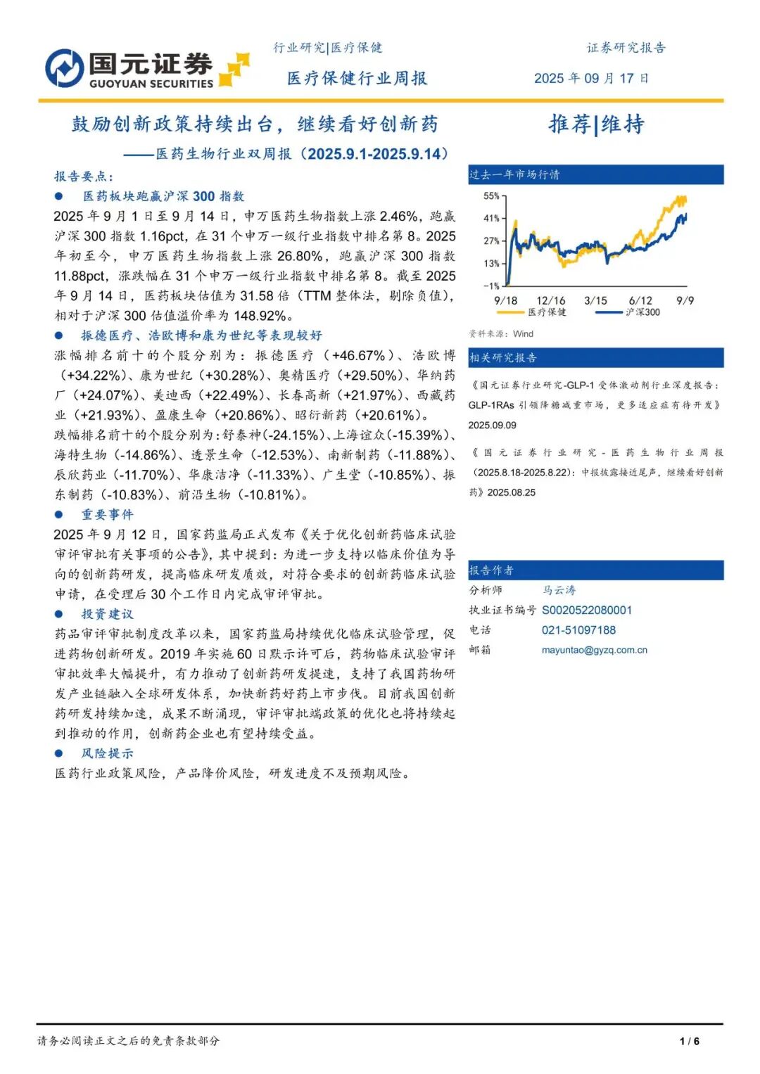 本报告摘自国元证券2025年9月17日已发布的《鼓励创新政策持续出台,继续看好创新药————医药生物行业双周报(2025.9.1-2025.9.14)》,具体报告及分析内容请详见报告。若因对报告的摘编等产生歧义,应以报告发布当日的完整内容为准。