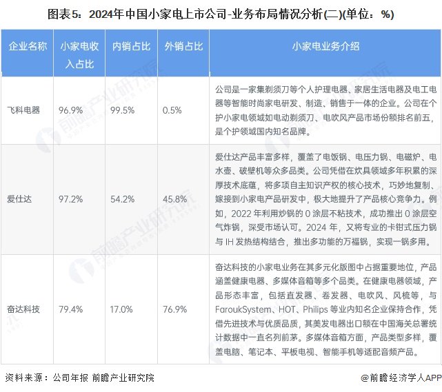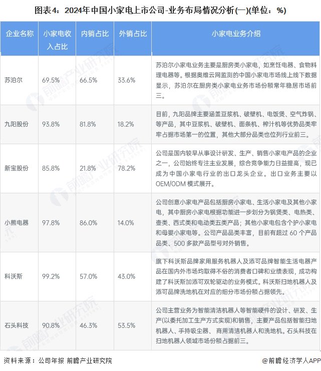 在小家电产业-整体制造的上市公司中,苏泊尔以厨房类小家电为主,市场份额常年稳居厨房类小家电前三;九阳股份产品涵盖豆浆机、破壁机等,其豆浆机等优势品类占据市场第一,多数品类位列行业前三;新宝股份是出口龙头,出口业务以 OEM/ODM 模式为主;小熊电器产品品类丰富,涵盖 60 多个品类、500 多款型号的创意小家电;科沃斯旗下科沃斯品牌家用服务机器人和添可品牌智能生活电器表现出色,扫地机器人和洗地机在细分市场份额领先;石头科技主营智能清洁机器人等,扫地机器人市场份额前三;飞科电器专注个人护理等电器,电动剃须刀等产品在个护领域市场份额前五;爱仕达产品多样,将炊具技术嫁接到小家电研发,推出多款受认可产品;奋达科技小家电业务涵盖健康电器、多媒体音箱等,美发电器出口额领先,与多家知名企业合作。各企业在小家电业务占比、内外销占比上也存在差异,如飞科电器内销占比高达99.5%,新宝股份、奋达科技外销占比则分别为 78.2%、76.9%。