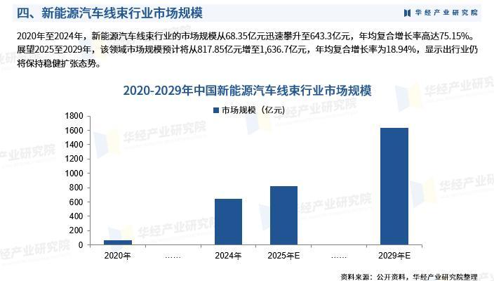 2020年至2024年,新能源汽车线束行业的市场规模从68.35亿元迅速攀升至643.3亿元,年均复合增长率高达75.15%。展望2025至2029年,该领域市场规模预计将从817.85亿元增至1,636.7亿元,年均复合增长率为18.94%,显示出行业仍将保持稳健扩张态势。