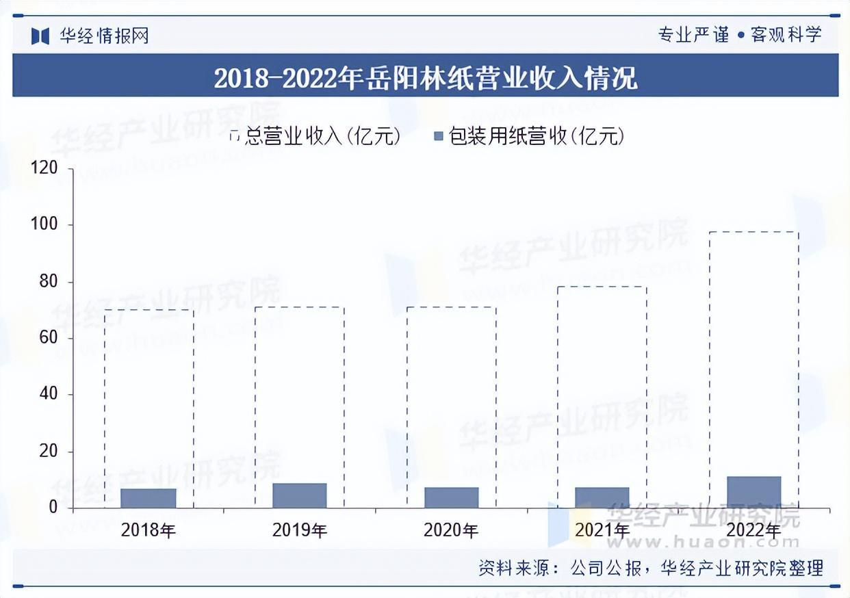 岳阳林纸股份有限公司前身为岳阳造纸厂,始建于1958年,属于国内大型文化用纸、包装用纸、工业用纸生产的造纸类企业。岳阳纸业拥有“中国环境标志(II型)产品认证”、食品包装纸生产许可证(QS)、森林产销链体系认证等。2022年,岳阳林纸的总营收为97.81亿;其中,包装用纸营收11.24亿元,毛利率为10.30%。