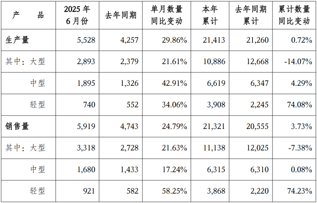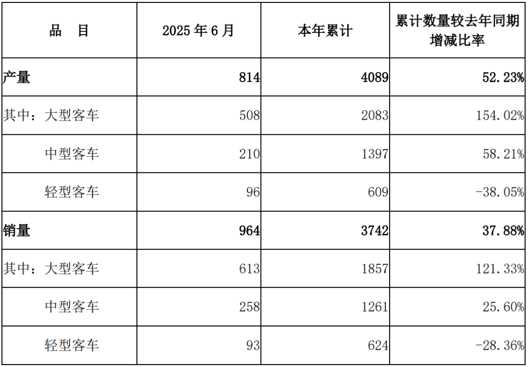 2025年1-6月,宇通客车共生产各类客车21413辆,同比增长0.72%,实现销售21321辆,同比增长3.73%。(参考6月份产销快报)