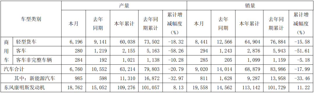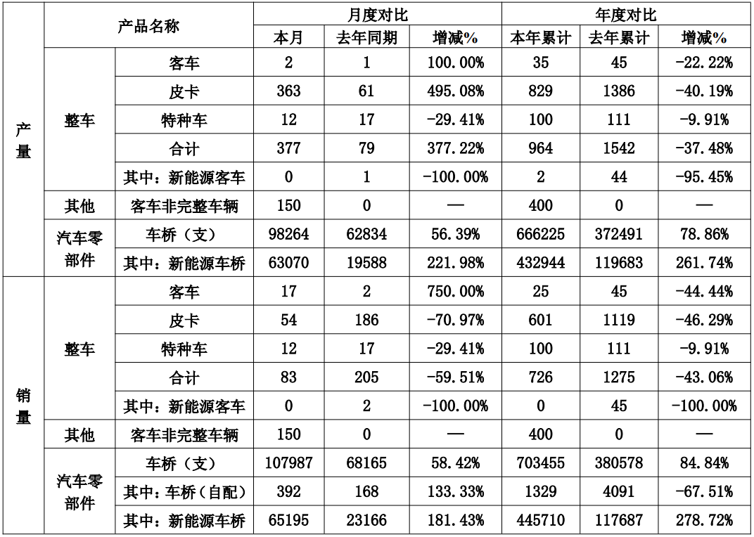 2025年1-6月,东风汽车共生产各类客车2155辆,同比下滑58.26%,实现销售2876辆,同比下滑51.61%。生产客车底盘1021辆,同比下滑10.28%,实现销售1099辆,同比下滑5.18%。(参考3月份产销快报)