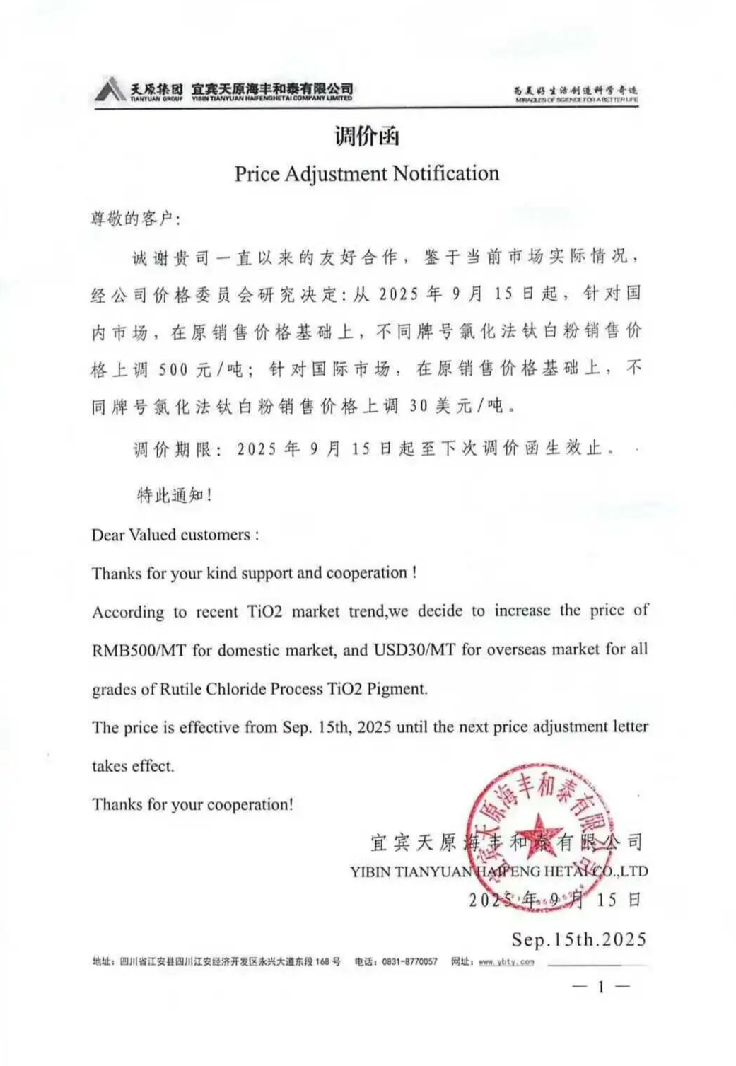 宜宾天原宣布,9月15日起,各型号钛白粉销售价格,在原价基础上对国内各类客户上调500元/吨,对国际各类客户上调30美元/吨。
