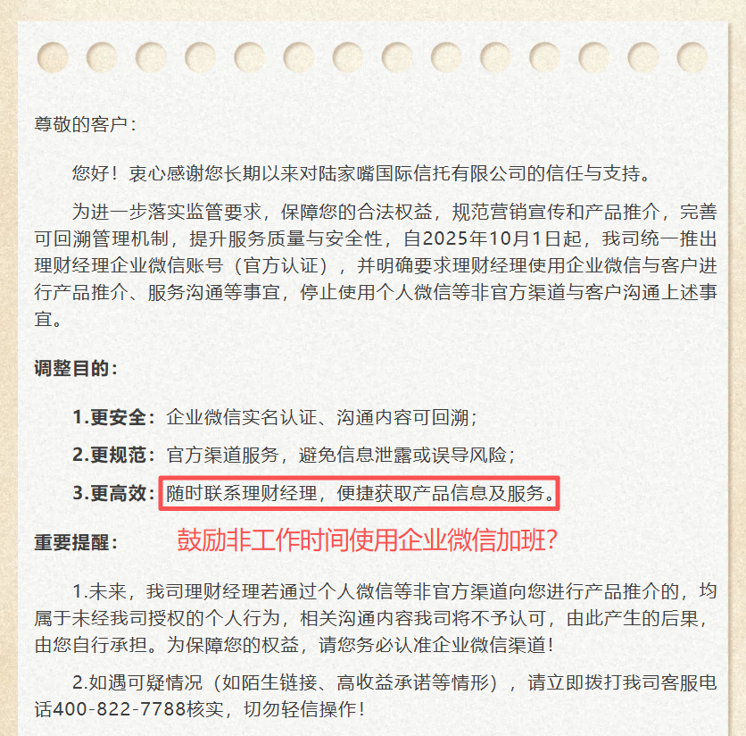 9月19日,陆家嘴信托发布《致客户告知书》表示,自2025年10月1日起,公司统一推出理财经理企业微信账号(官方认证),并明确要求理财经理使用企业微信与客户进行产品推介、服务沟通等事宜,停止使用个人微信等非官方渠道与客户沟通上述事宜。