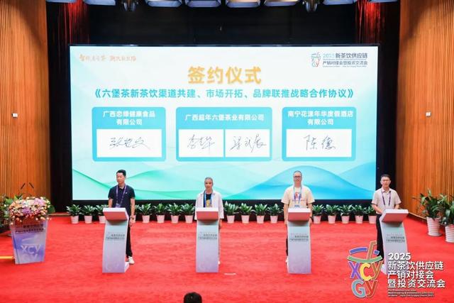 广西超年六堡茶业有限公司、广西恋绿健康食品有限公司、南宁花漾年华度假酒店有限公司签署了《六堡茶新茶饮渠道共建、市场开拓、品牌联推战略合作协议》。
