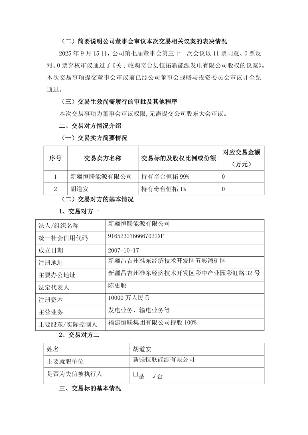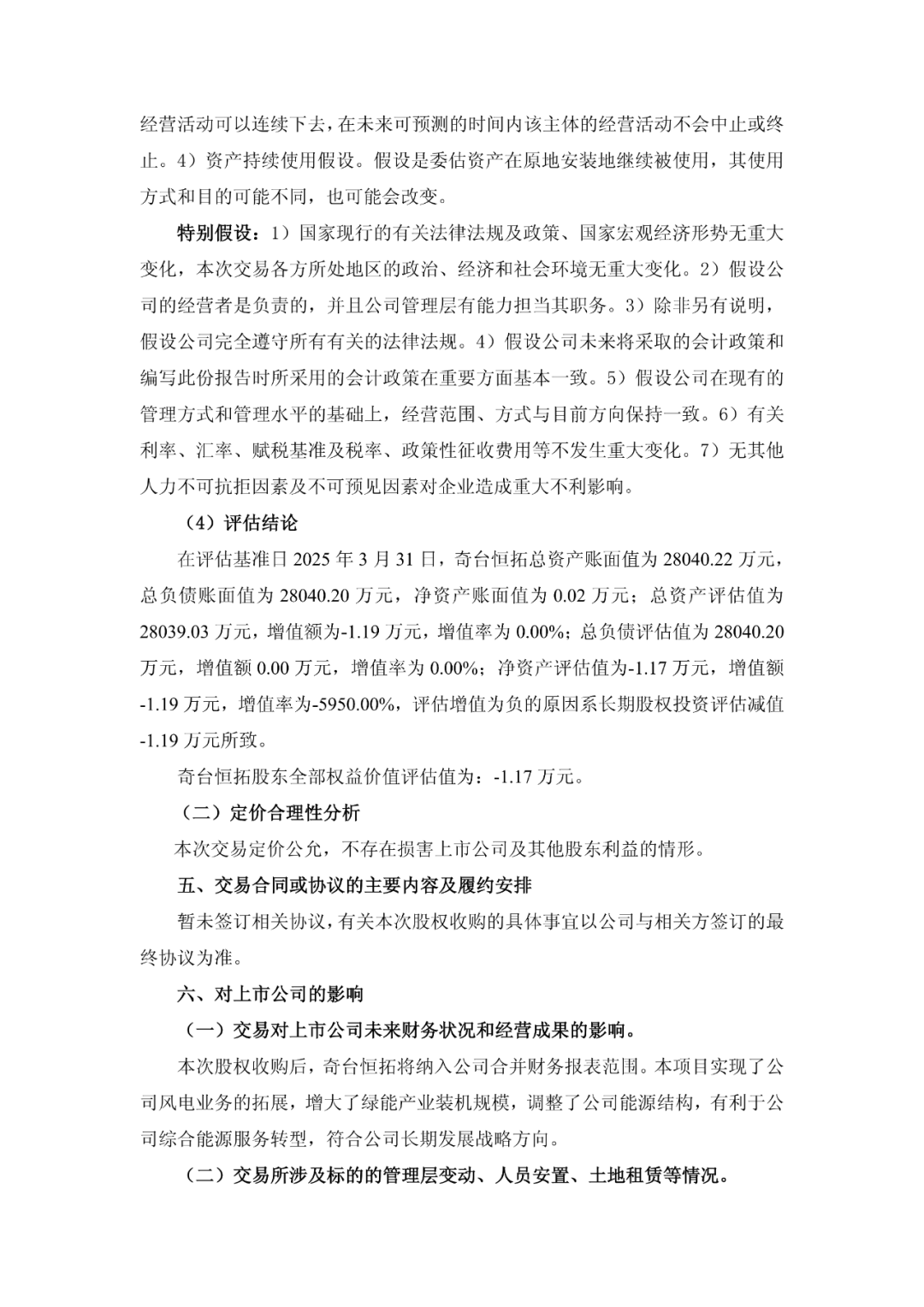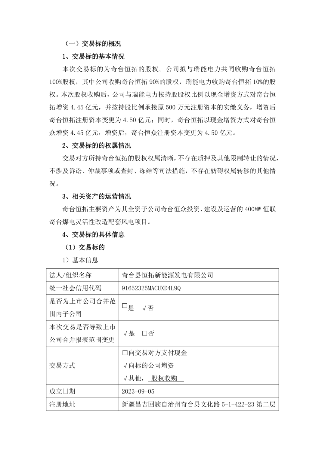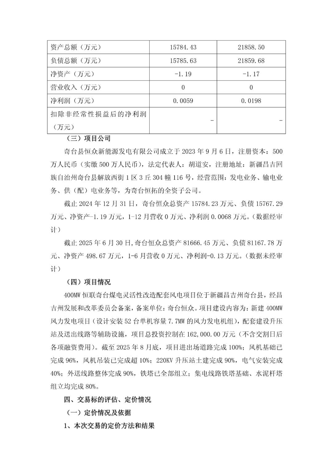 标的公司奇台县恒众新能源发电有限公司成立于2023年9月6日,注册资本:500万人民币(实缴500万人民币),为奇台恒拓的全资子公司。截止2024年12月31日,奇台恒众总资产15784.23万元、负债15767.29万元、净资产-1.19万元,1-12月营收0万元、净利润0.0068万元。(数据经审计)截止2025年6月30日,奇台恒众总资产81666.45万元、负债81167.78万元、净资产498.67万元,1-6月营收0万元、净利润-0.13万元。(数据未经审计)