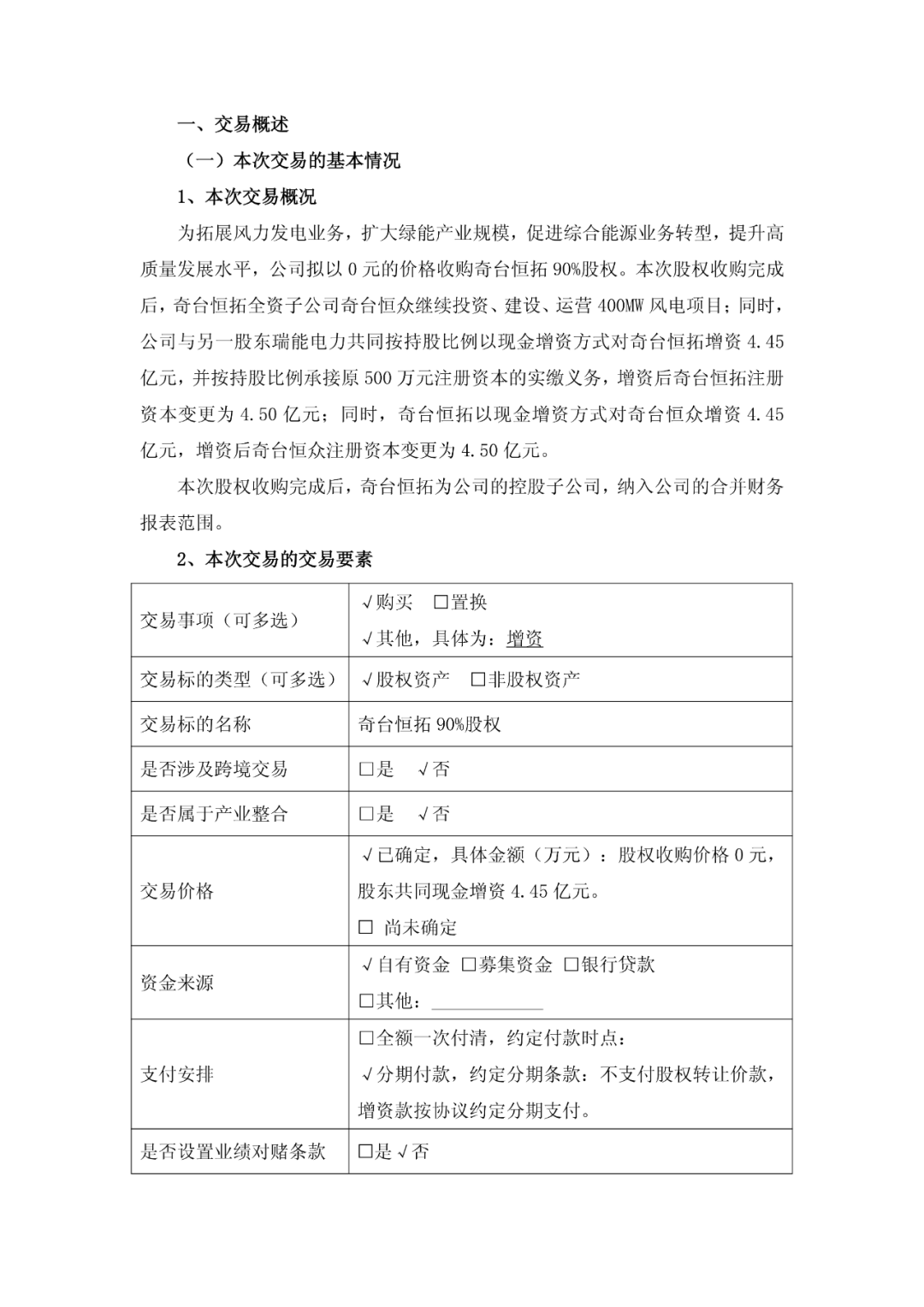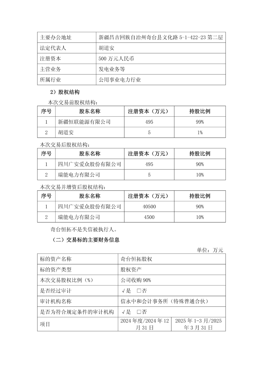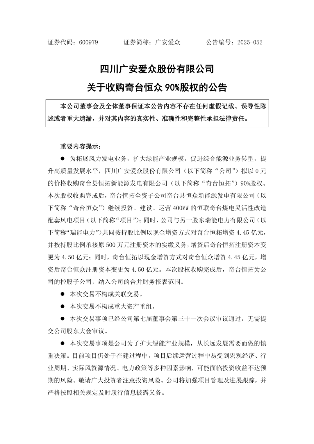 本次股权收购完成后,奇台恒拓全资子公司奇台恒众继续投资、建设、运营400MW风电项目;同时,广安爱众与另一股东瑞能电力共同按持股比例以现金增资方式对奇台恒拓增资4.45亿元,并按持股比例承接原500万元注册资本的实缴义务,增资后奇台恒拓注册资本变更为4.50亿元;同时,奇台恒拓以现金增资方式对奇台恒众增资4.45亿元,增资后奇台恒众注册资本变更为4.50亿元。