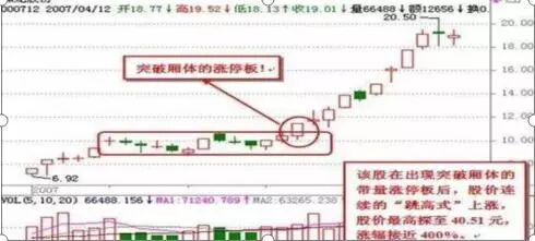 如果股价以涨停板的方式突破了近期股价震荡形成的厢体上轨,那么就意味着多头已经摆脱了空头的束缚,很可能出现“海阔任鱼越”的走势,在这个涨停板之后很可能出现持续性的上涨。