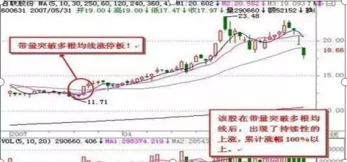 股价以涨停板的方式带量突破多根均线,有一种“快刀斩乱麻”的感觉,是多头横扫空头的表现,这种股票容易出现中长线的行情。