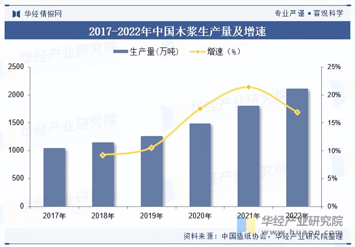 整体来看,我国的木浆生产量呈稳定增长态势,并且增速处于高位运行状态;2022年,中国木浆生产量为2115万吨,较上年增长16.92%,增幅显著。