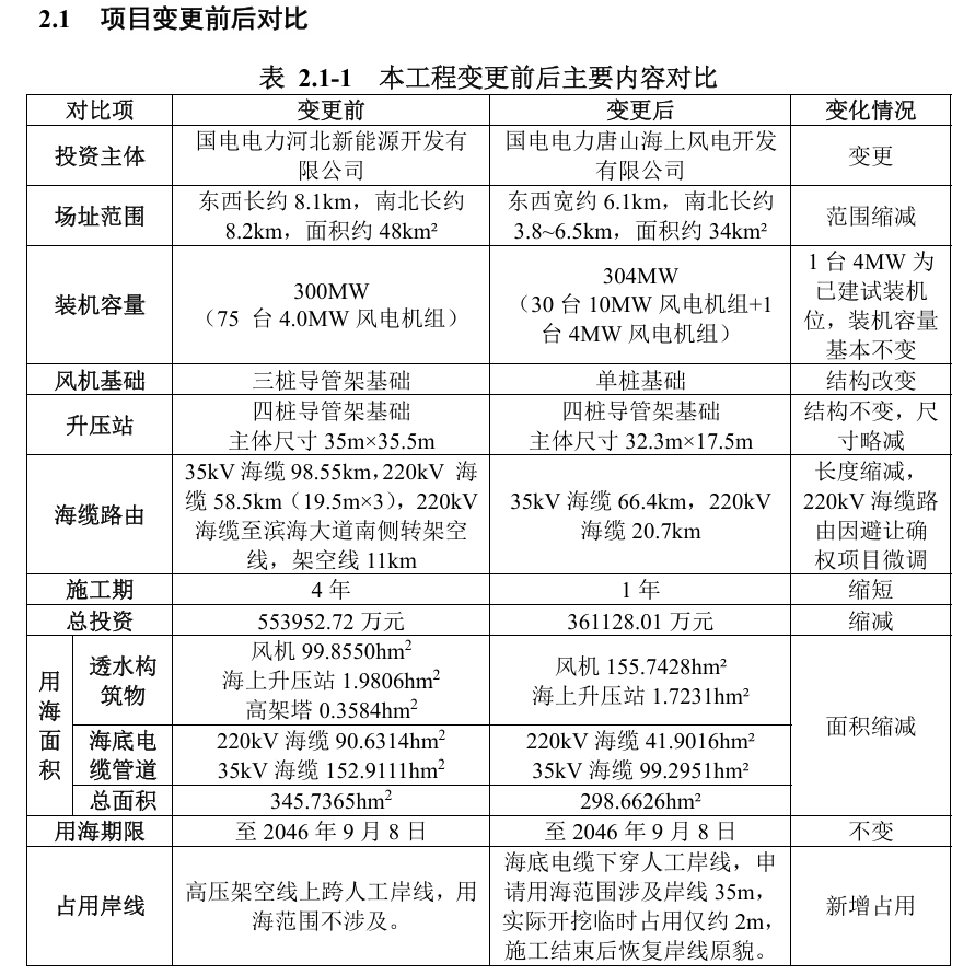 该项目投资主体变更为国电电力唐山海上风电开发有限公司,工程总投资361128.01万元,施工期12个月。项目年理论发电量为151625万kWh,年设计发电量为136569万kWh,年上网电量为106524万kWh,年等效满负荷小时数为3504h,平均尾流影响系数为9.91%。