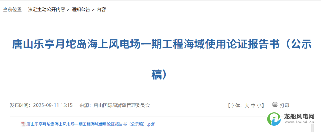 9月11日,河北省唐山国际旅游岛管理委员会发布《唐山乐亭月坨岛海上风电场一期工程海域使用论证报告书(公示稿)》。