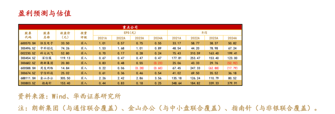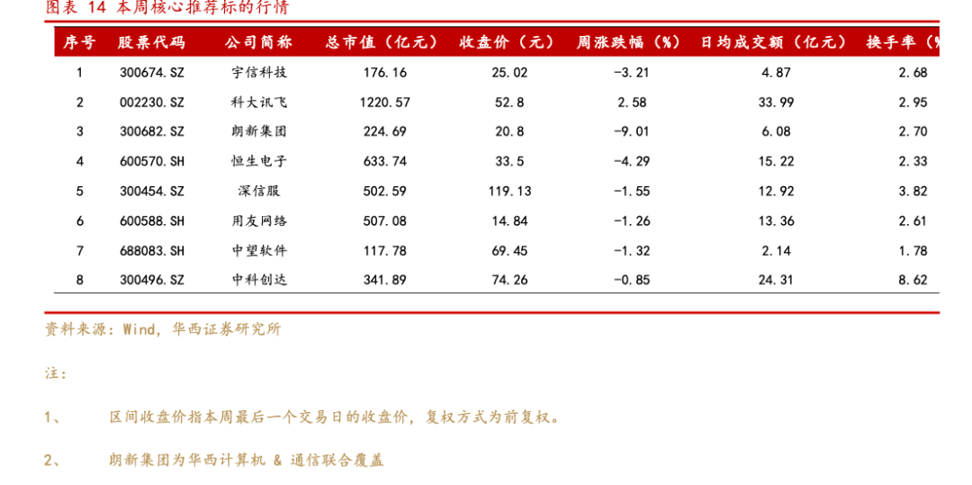 本周板块整体呈现普遍下跌的情况下,我们的8只核心推荐标的7只下跌,1只上涨。其中跌幅最大的为朗新集团,跌幅为9.01%。上涨的为科大讯飞,涨幅为2.58%。