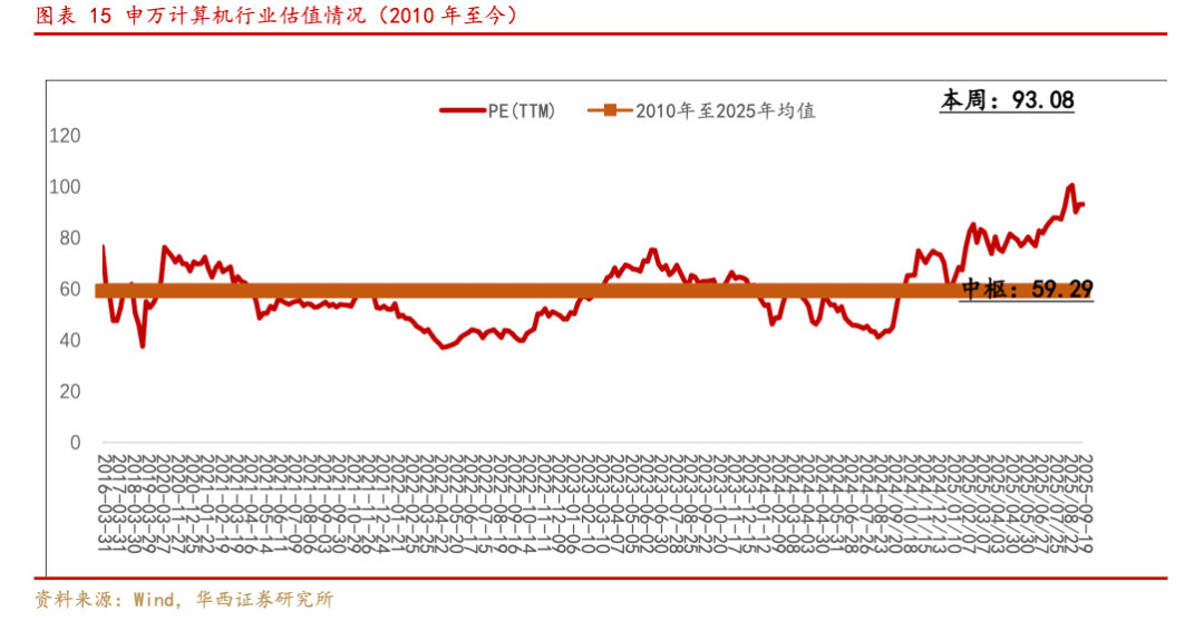 从估值情况来看,SW计算机行业PE(TTM)从2018年低点37.60倍升至93.08倍,2010-2025年历史均值59.29倍,行业估值高于历史中枢水平。