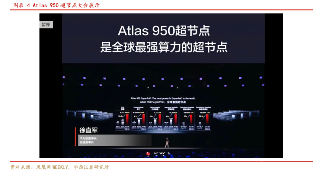 根据财联社,会上透露华为超节点Atlas 950 SuperPoD,算力规模8192卡,预计于2026年四季度上市,而Atlas 960 SuperPoD,算力规模15488卡,预计2027年四季度上市。根据第一财经,“Atlas 950超节点,至少在未来多年都将保持是全球最强算力的超节点,并且在各项主要能力上都远超业界主要产品。其中,相比英伟达同样将在明年下半年上市的NVL144,Atlas 950超节点卡的规模是其56.8倍,总算力是其6.7倍,内存容量是其15倍,达到1152TB;互联带宽是其62倍,达到16.3PB/s。即使是与英伟达计划2027年上市的 NVL576相比,Atlas 950超节点在各方面依然是领先的。”