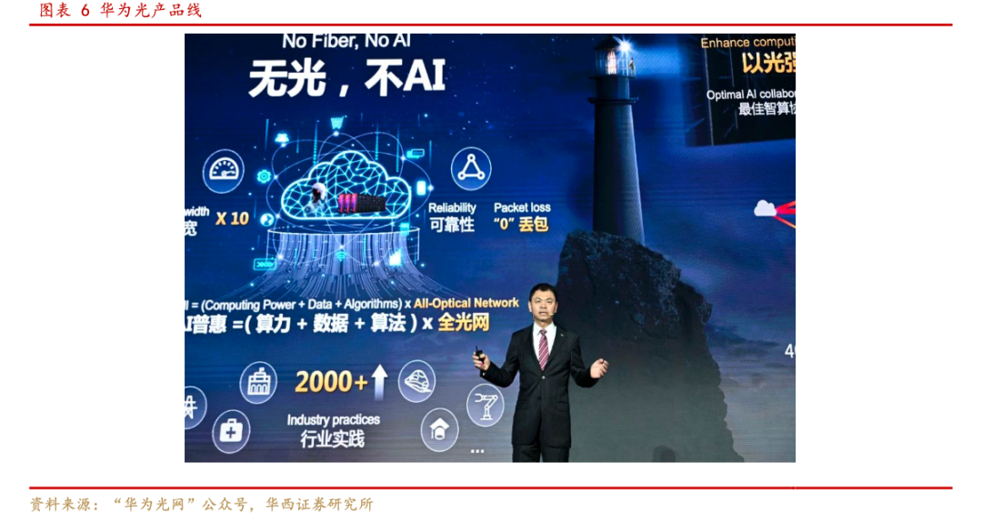 面向新型电力系统建设,华为发布边缘智算板,联合伙伴开发智能融合终端,实现对分布式光伏功率、台区负荷的实时感知与精准预测,助力低压配电网向“自感知、自决策、自优化”演进,推动“以光促算”在电力场景落地。面向ISP家宽场景,华为秉承从“一根纤”、到“一张网”、再到“一个智能家”的解决方案构建理念,推出AI抗干扰Wi-Fi 7 ONT,实现家庭接入速率迈入万兆时代,稳定支撑AI应用高速访问。基于AI-FTTR,为ISP打造了2D转3D视频等功能,提供影院级3D体验,并支持语音交互、AI Agent部署等新功能,打造AI时代家庭智能中枢,抢占智慧家庭服务入口,实现“以光惠算”。